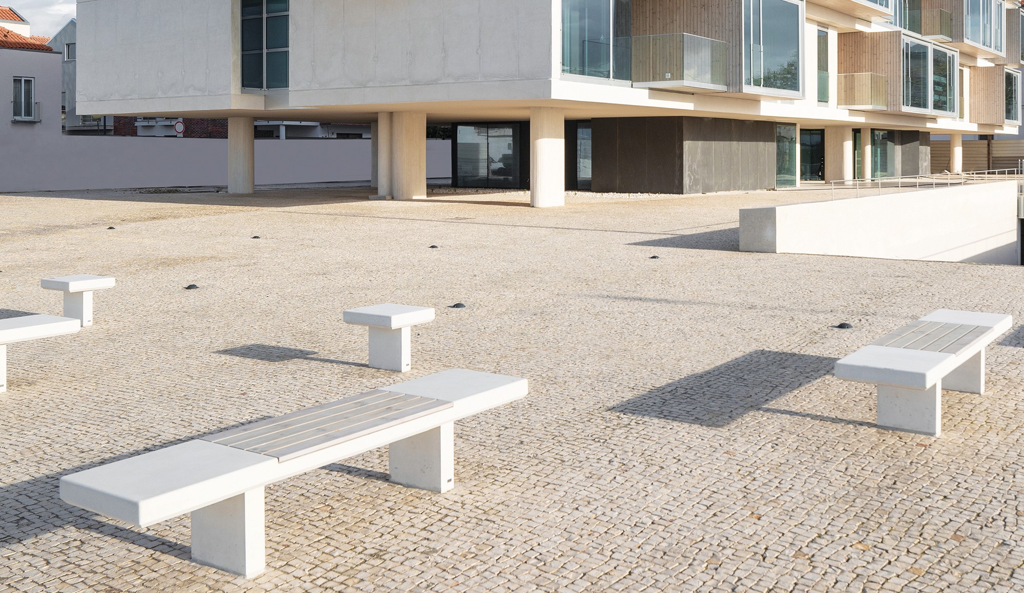 Mobiliário Urbano fabricado em betão CS/ES Cast Stone /Engineered Stone. Acabamentos disponíveis em Liso, Pintado ou Bujardado.